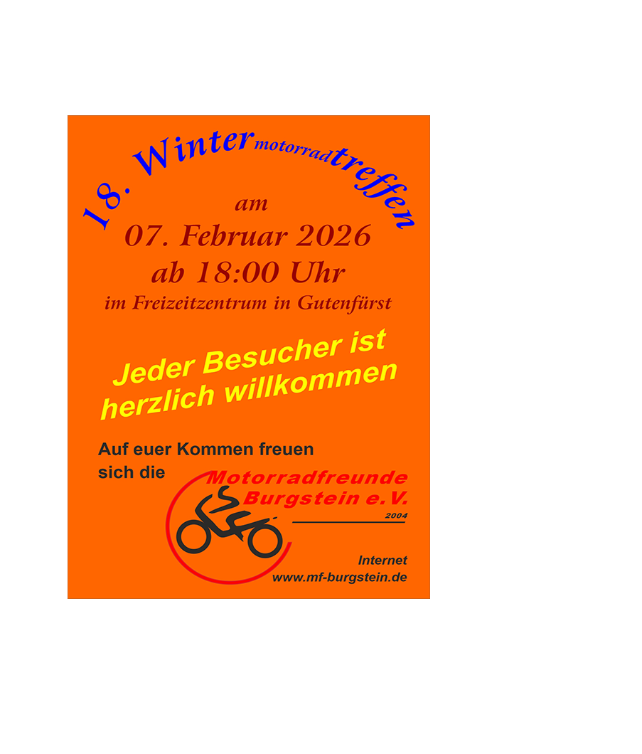 Wir sind ein kleiner Club von Motorradfreunden am Burgstein im Vogtland. In unserem Club sind alle Arten von Motorrädern wie zum Beispiel Tourer, Supersportler, Enduros, Chopper und Gespanne mit verschiedensten Baujahren von neu bis alt vorhanden. Diese Vielfalt von Motorrädern werden auch gerne im Club begrüßt.